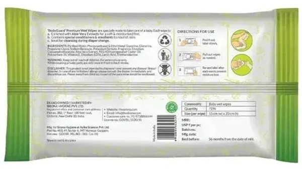 BodyGuard Premium Paraben Free Baby Wet Wipes with Aloe Vera (1 Pack, 72 each), 72 wipes