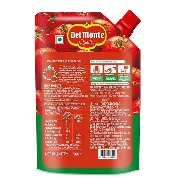 Indulge in the classic flavor of Del Monte Quality Tomato Ketchup, available in a practical 500g pack. Whether you're dressing up burgers, adding zest to fries, or giving a tangy twist to your recipes, Del Monte ketchup is the perfect addition to enhance your culinary creations with its superior taste and quality.