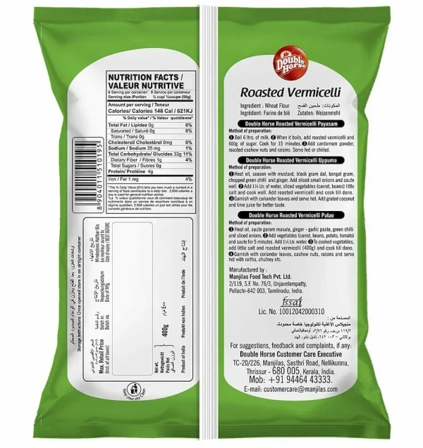 Double Horse Roasted Vermicelli, presented in a 400g pack, offers a quick and convenient solution for busy meal times. This pre-roasted vermicelli is an ideal choice for creating a variety of dishes ranging from savory upma to sweet kheer. Its pre-roasted nature not only enhances the flavor but also reduces cooking time, making it a favorite for those who need to whip up meals in a hurry.