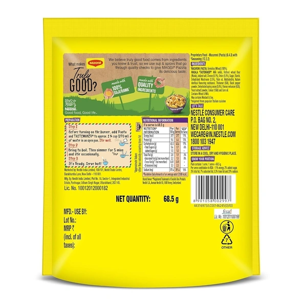 Ingredients: Pasta (Durum Wheat Semolina), Mushroom, Milk Solids, Wheat Flour, Edible Vegetable Oil, Iodized Salt, Sugar, Spices and Condiments, Yeast Extract, Flavor Enhancer (635), and Acidity Regulators (451(i), 501(i)).