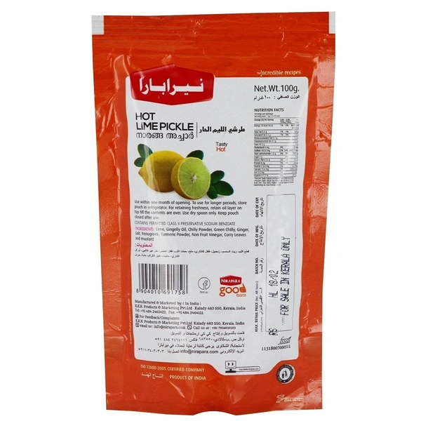 Experience the bold flavors of Kerala with Nirapara Hot Lime Pickle, now in a handy 100g pouch. This pickle combines the intense heat of spices with the tangy zest of lime, creating a flavorful condiment that's perfect for adding a spicy kick to any meal. Whether you're spicing up your curry, giving a zesty touch to sandwiches, or enhancing the flavor of your salads, Nirapara Hot Lime Pickle is an excellent choice for anyone who loves a bit of heat with their meals.